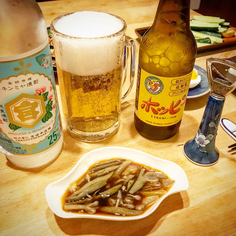 じゅんさいはホッピーで。今日の野菜はじゅんさい以外は全部、我が家の庭の畑から。幸せ。