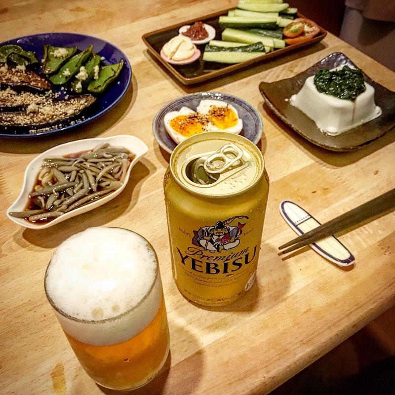 カミさんは遅くまで仕事。ひとり居酒屋我家、開店。猛暑日の炎天下働いて帰って頭ちょっとガンガン。お中元にいただいたヱビスビールで始める。