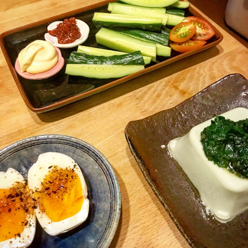 枝豆豆腐にモロヘイヤの叩き、きゅうりは部落のばっぱが漬けた梅干しの叩きとマヨネーズで。半熟ゆで卵。