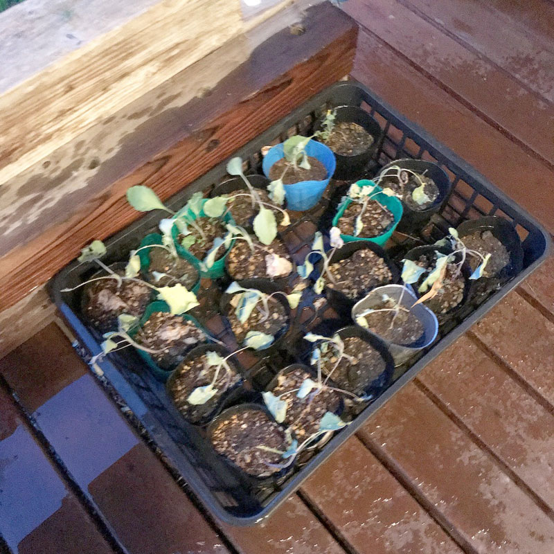 日の光が必要だけど乾燥に弱くて日向に移動したり、日陰に移動したり、芋虫をとったり、こまめに水をやった。ここまで育てるの大変だった手のかかるコールラビの苗。痛恨のミス!日陰に移すの忘れて東京行って昨夜戻ったら全部しおれて枯れそうになってる。とりあえずダメもとでたっぷり水だけやっておく(汗)