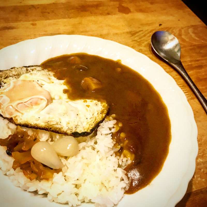 カレー。白身の縁をカリッと焼いた目玉焼きを乗せて。ちょっとフライパンの温度を上げすぎて黄身も白身もイメージと違ってしまったけど美味しい。カリッとした卵の白身が好きでいつもは生卵をそのまま熱した油に落としている。目玉焼きの英語はフライドエッグだけど本当の意味でのフライドエッグだね。じっくりと油であげると白身が焦げてカリカリになる。これをカレーのトッピングにするのが美味しいのだ。今回は、ほぼ日でフードスタイリストの飯島奈美さんの記事を読んでいて目玉焼きバージョンが食べたくなってしまったのだ。
