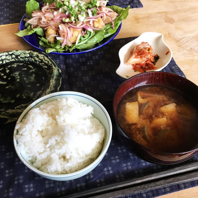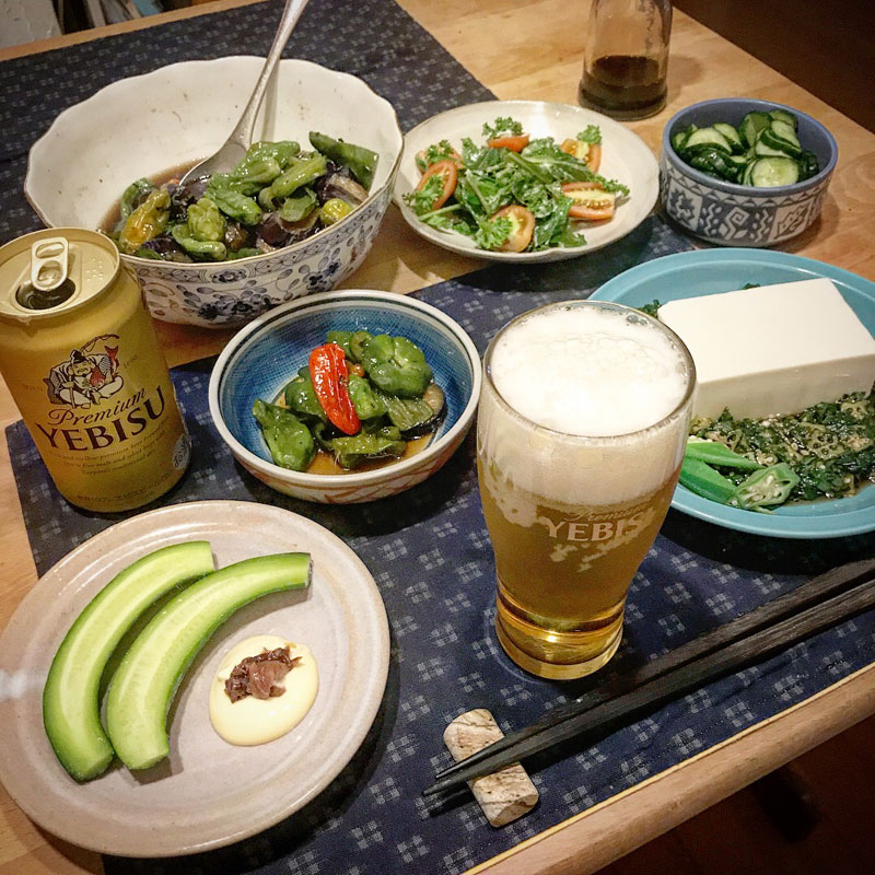 居酒屋我家、開店。一日石を彫ってる、部落の会合を終えて、ちょっと遅い開店。畑の野菜中心の酒菜。ルッコラのサラダ。きゅうりの梅マヨ。きゅうりの塩もみ。いただいたエビスビール。
