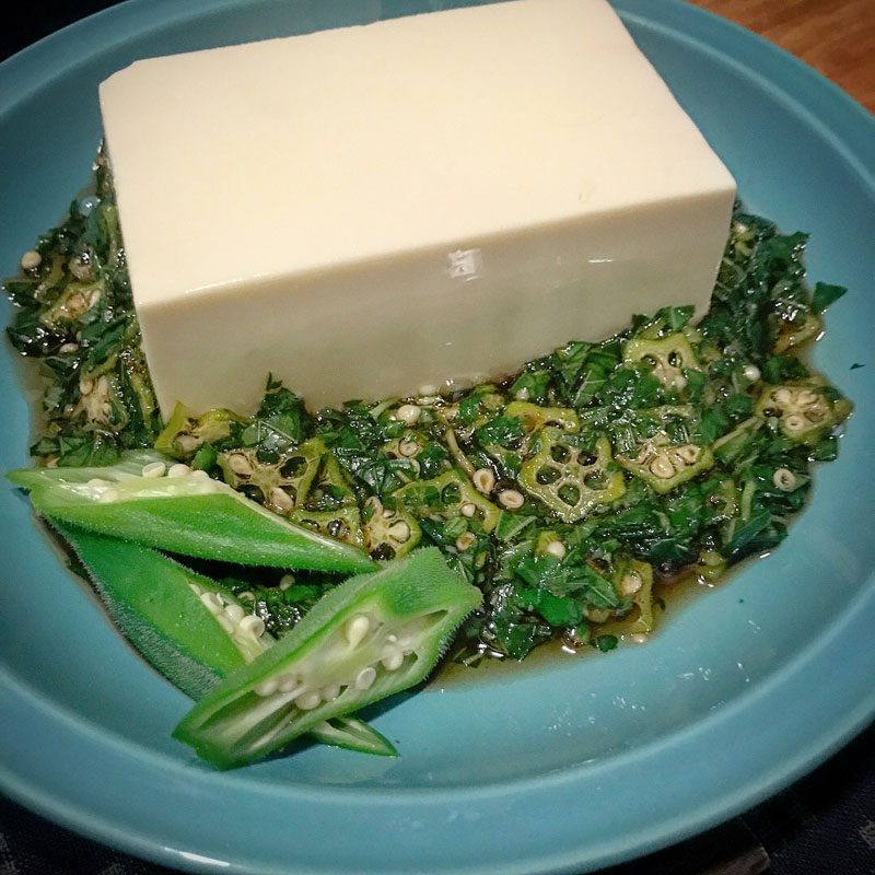 モロヘイヤのタタキとオクラ醤油で食べる冷奴、うまー!