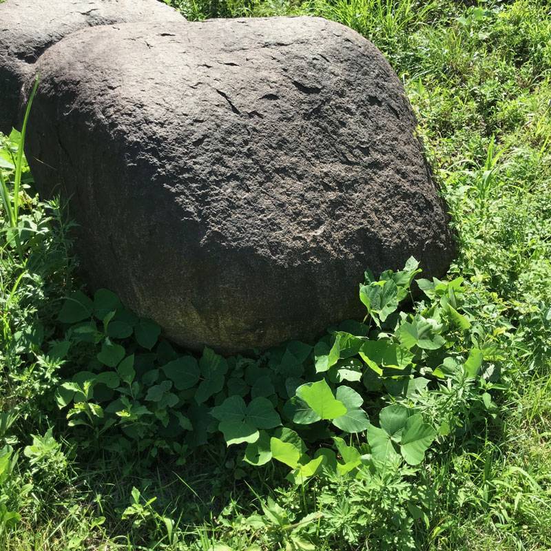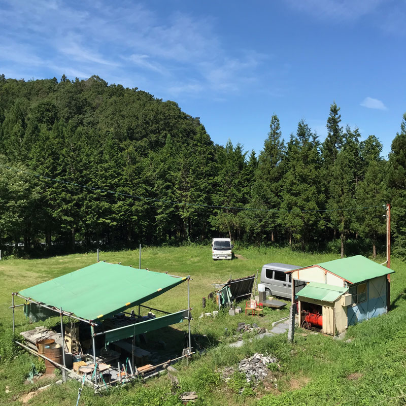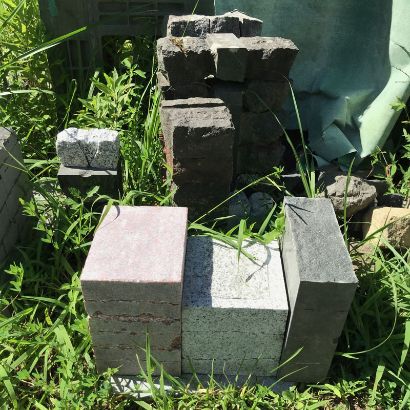 石を割って再構成する作品を多く作っている。いくつもに割った石が仕事場にたくさんストックしてある。