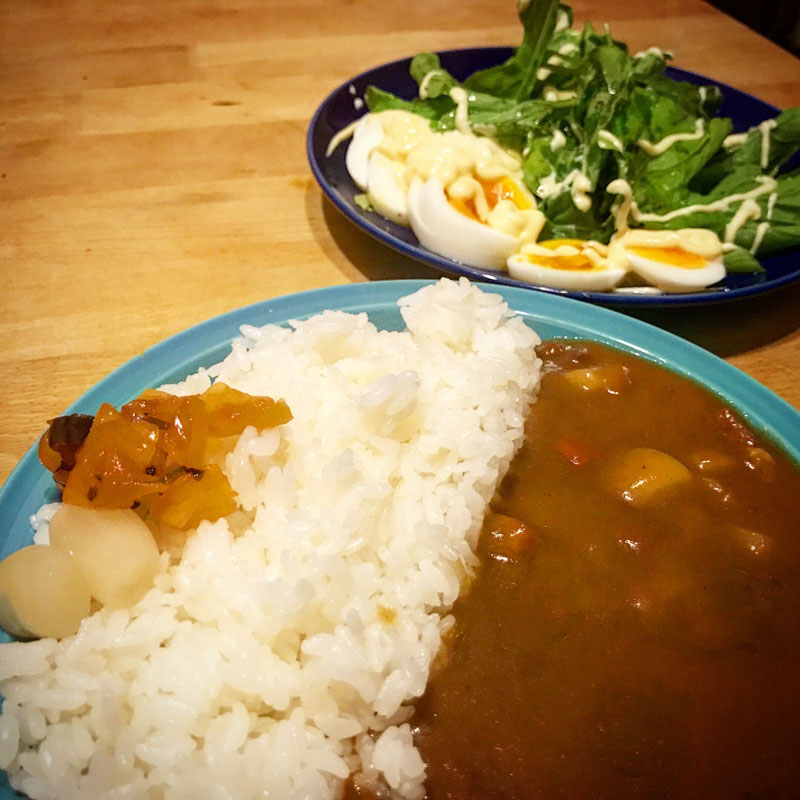 カレーとルッコラのサラダの夕食。この夏もルッコラのサラダ食べたなぁ。