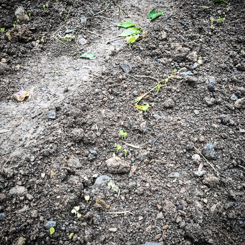 良いタイミングで雨が降ってくれて蒔いた大根の種が一斉に発芽した。葉っぱを食べたいので少し密に蒔いて間引きしながら食べる。