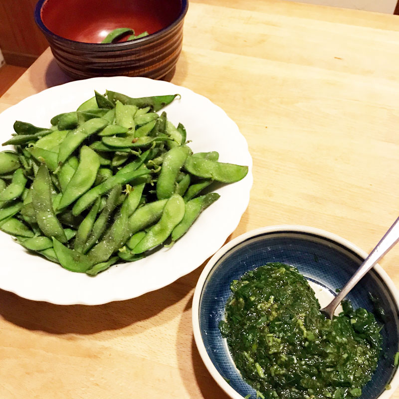 で、茹でた。枝豆はうちわで仰いで空冷で急冷。モロヘイヤは水冷。さっと水で冷やして絞って醤油と小ネギと共に叩く。