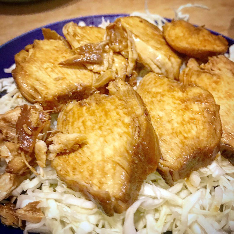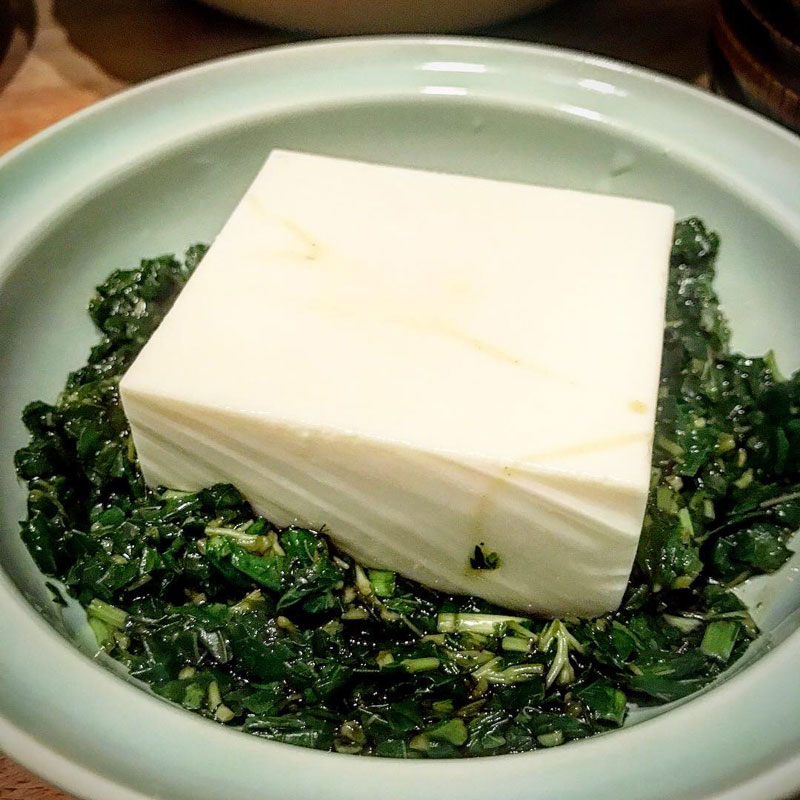 モロヘイヤと小ネギを醤油とタタキて冷奴に乗せたもの、