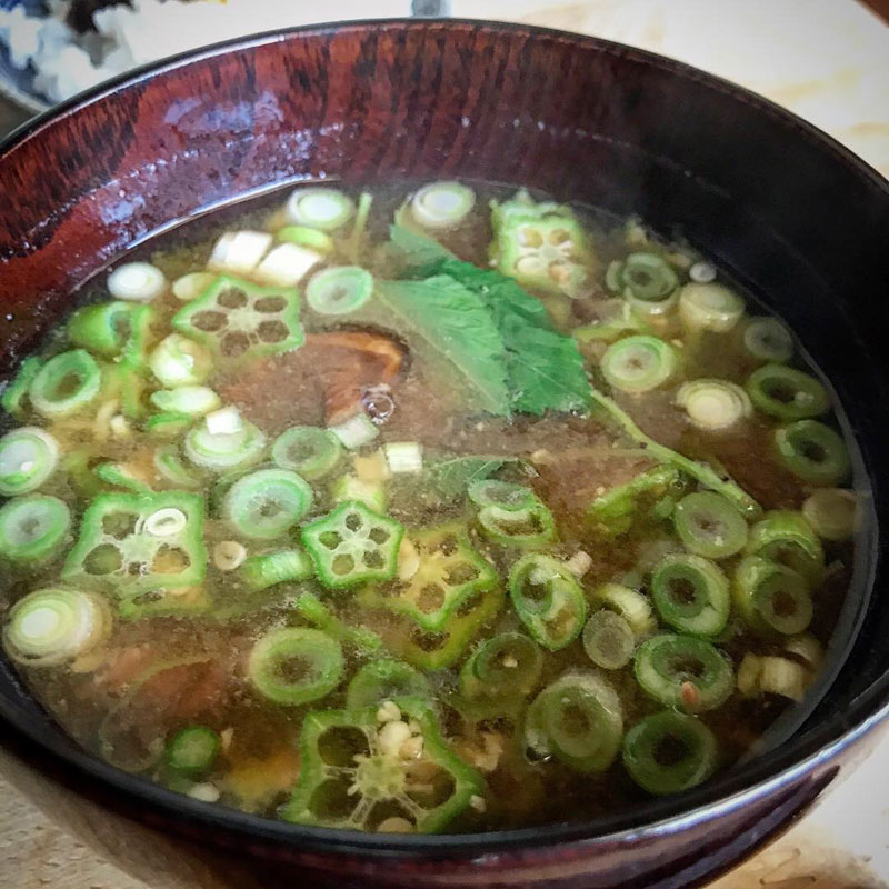 なめこの味噌汁に畑からモロヘイヤとオクラを採ってきて長ネギと共に。ネバネバ最高。