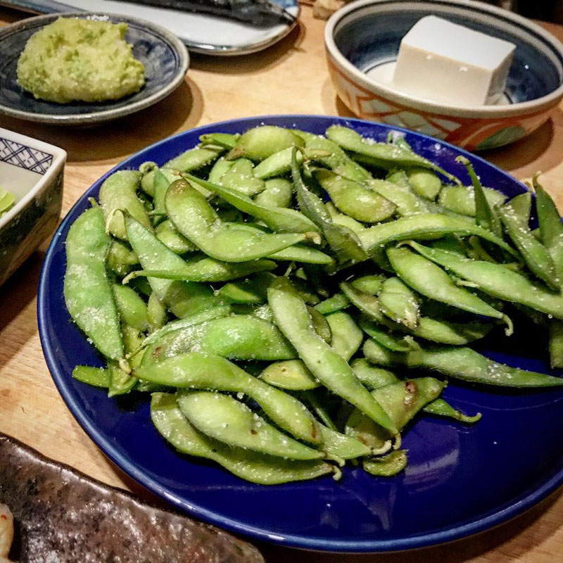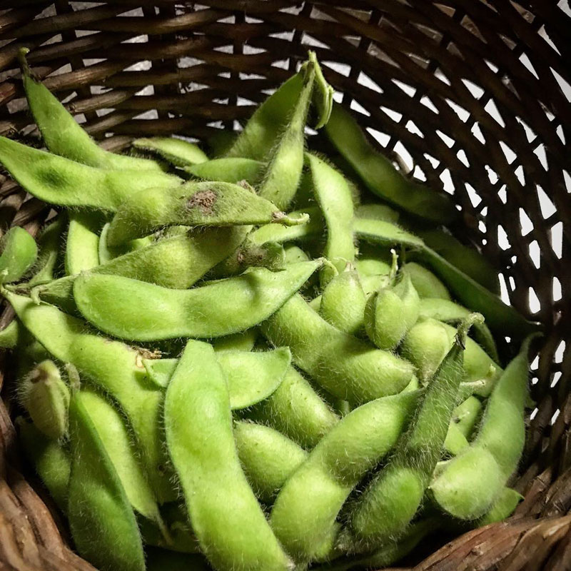 畑の茶豆、オリーブの花から得られた酵母で作られた小豆島の醤油で冷奴、鶏肉の中華くらげ、いただいた手作りのずんだ餅。