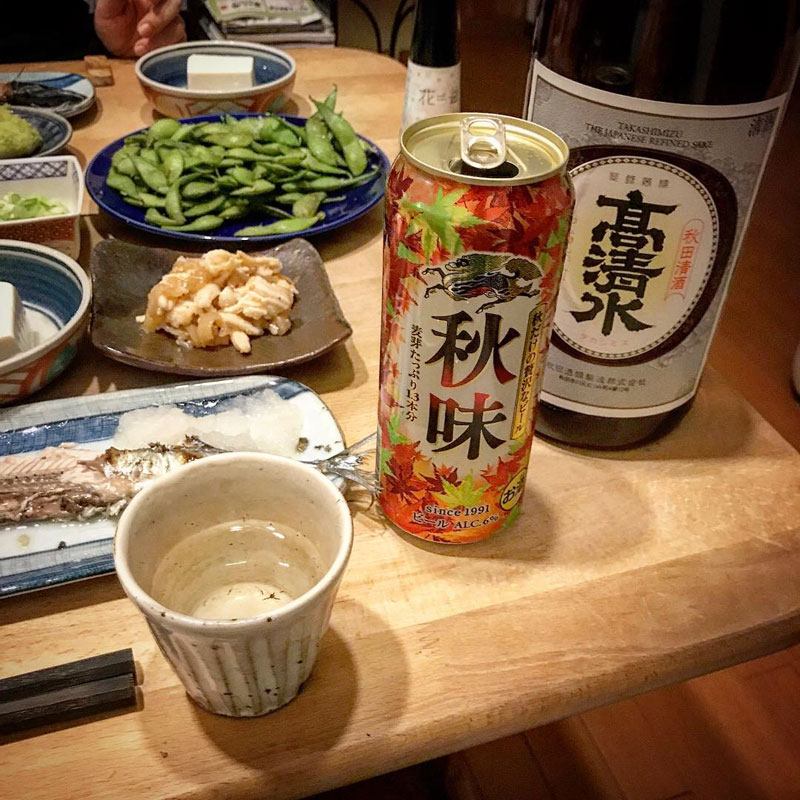 いつもの金麦の前に秋味のビール、秋田の大好きな日本酒、高清水を塩焼き秋刀魚に合わせて一杯だけ。