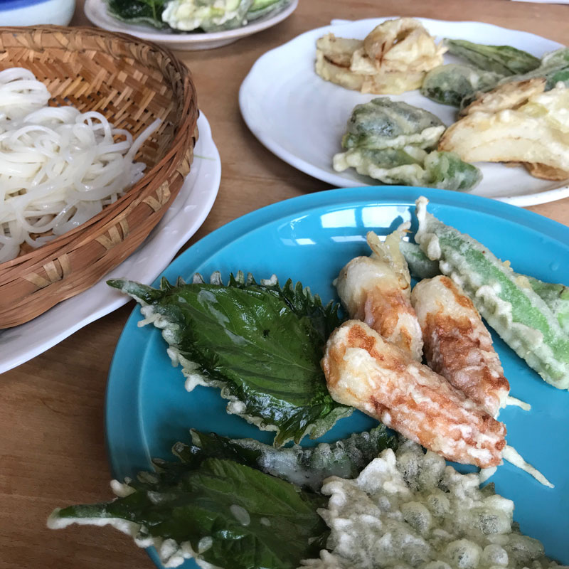 畑の紫蘇の葉をカミさんに天ぷらにしてもらった。オクラやピーマンも。