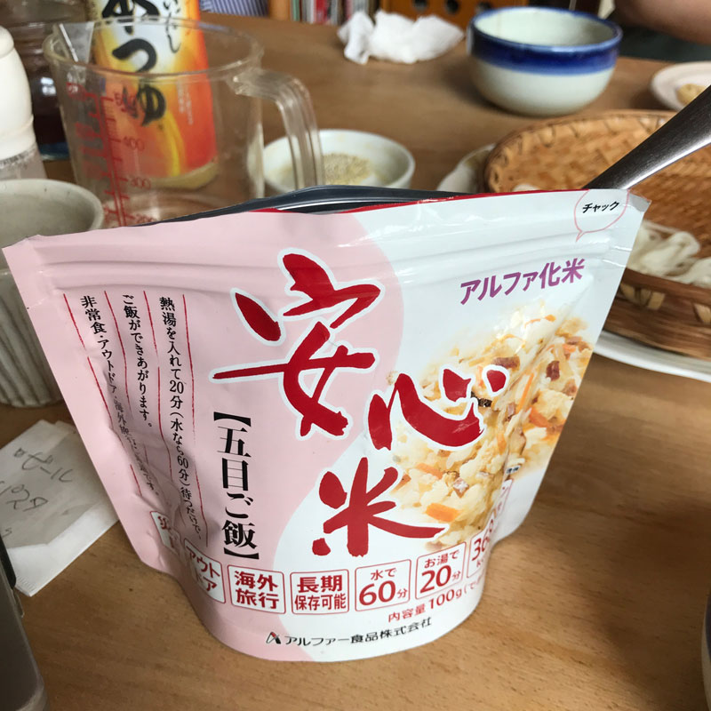 賞味期限から1年位たった防災用のアルファ化米。いざとなればこのパックに水をいれるだけで出来上がり。美味しいし。防災用の非常食は乾パンではきつい。