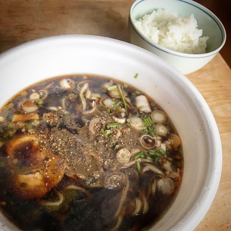 ネギをトッピング。ラーメンライスの昼食。富山ブラックも一度本物を食べてみたい。