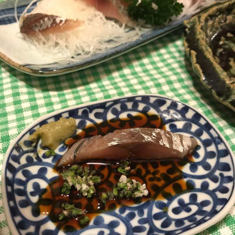 鯵の刺身はネギをトッピング。ラーメンライスの昼食。富山ブラックも一度本物を食べてみたい。