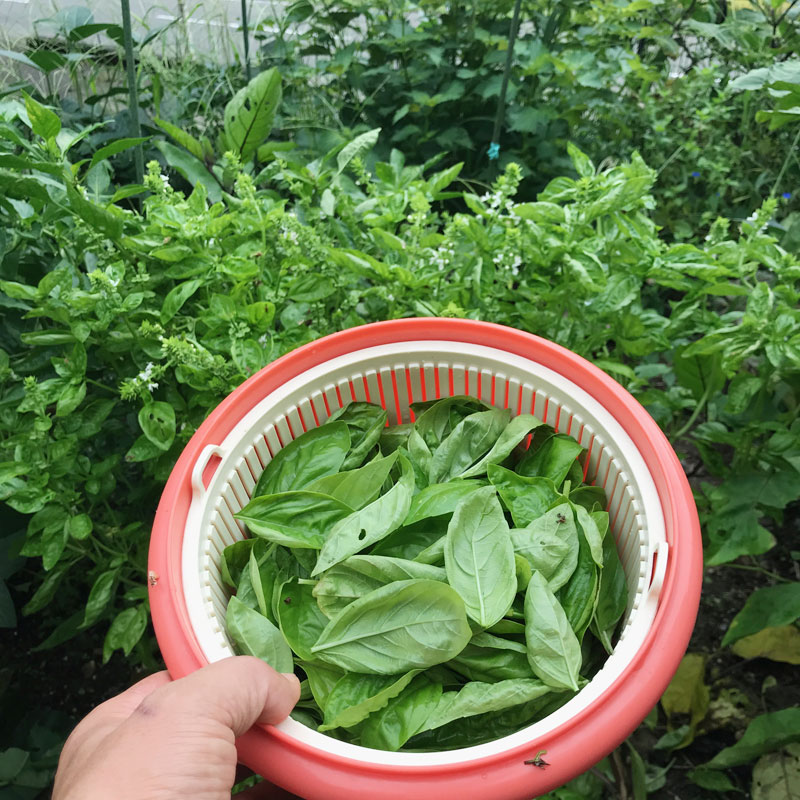 台風の直撃に備えてきれいな葉を摘んでおいた、畑のバジル。