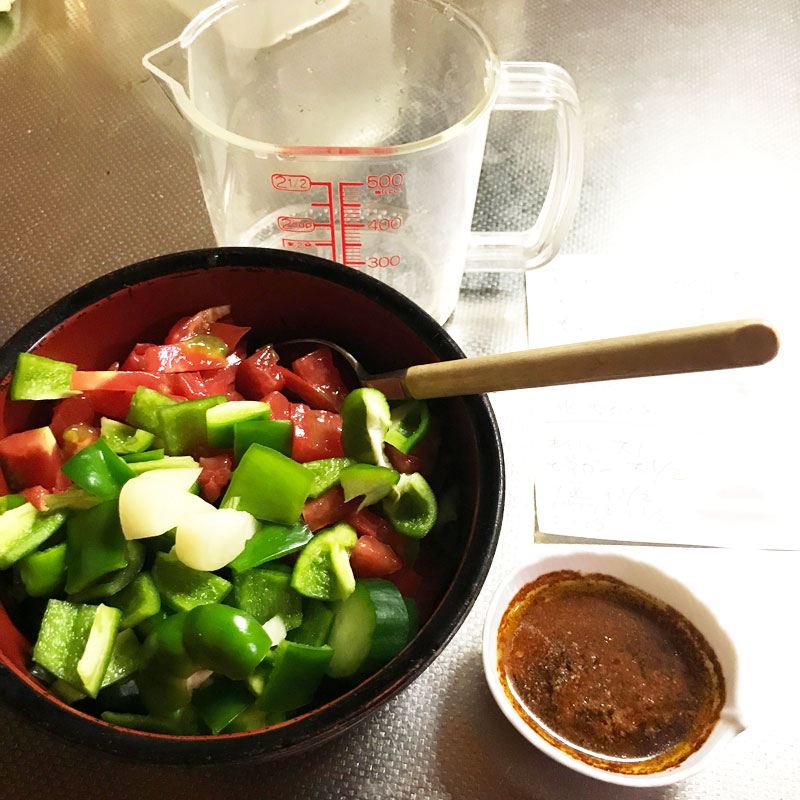 昨日、またガスパチョを作っておいた。買ったトマトと庭の畑の野菜。調味液。
