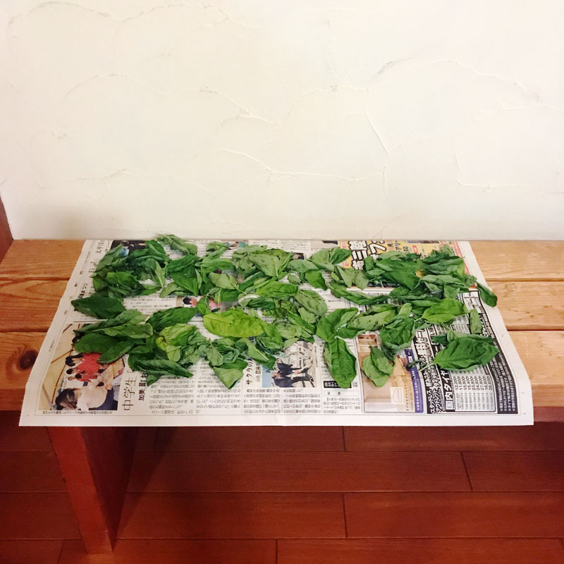 畑から一枚一枚摘んだ葉は新聞紙の上で乾燥中。