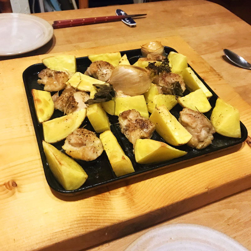 鶏肉とジャガイモとニンニクのグリル。オリーブオイル、塩、胡椒、ハーブで20分弱グリルしただけ。スペインの家庭料理。