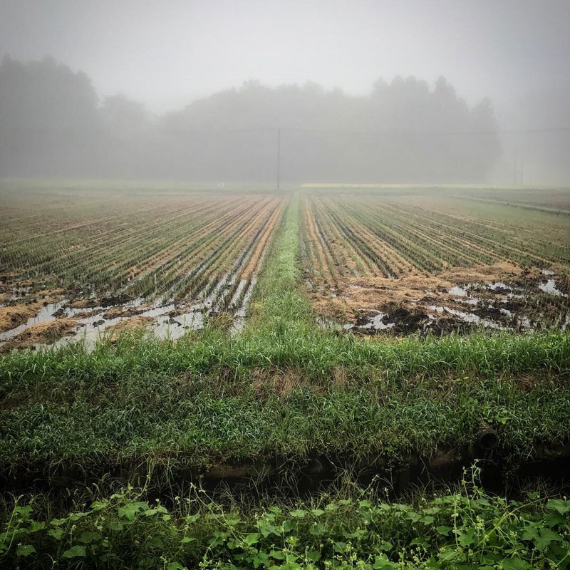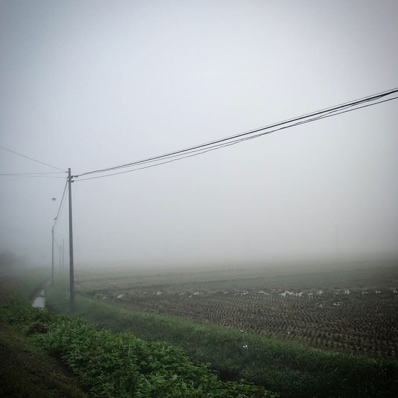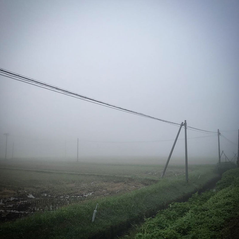 早朝だし、濃霧だし、寝間着のまま家の前で