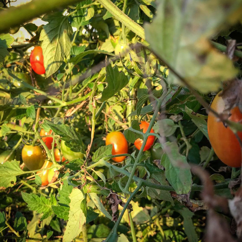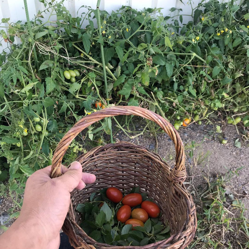 今宵のためにミニトマトとモロヘイヤ摘む。