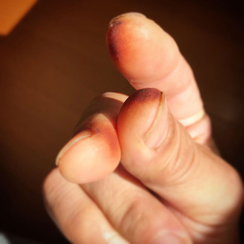 親指と人差し指と中指の先でプチプチと実を取る感じ気持ちいい。灰汁で真っ黒になって洗ってもとれないけど。