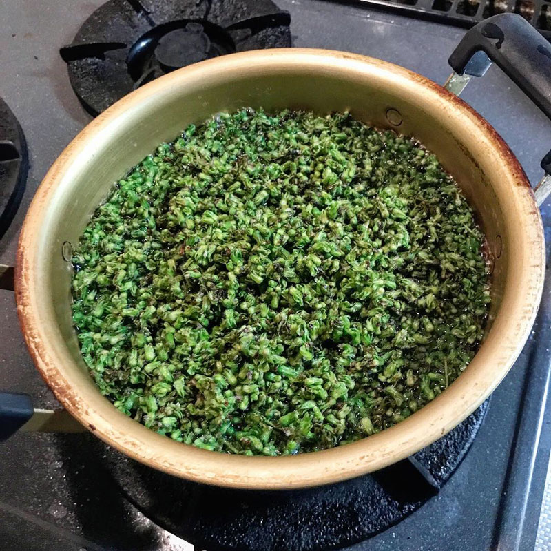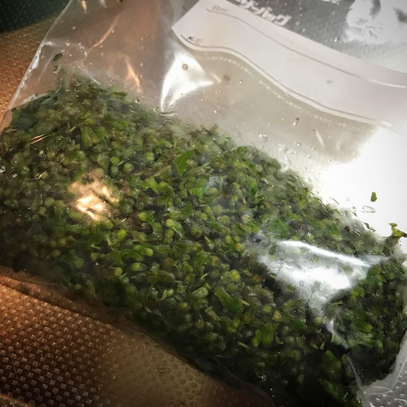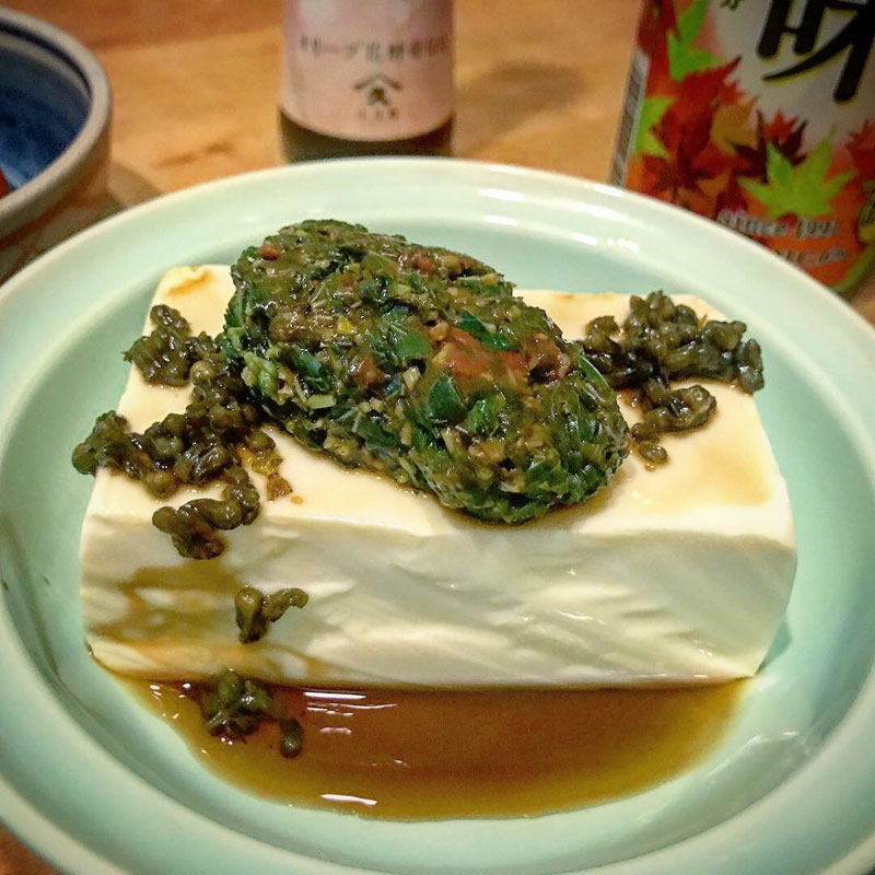 モロヘイヤ、今年最後かもしれないなぁ。紫蘇の実の醤油漬けも醤油と共に乗せて。