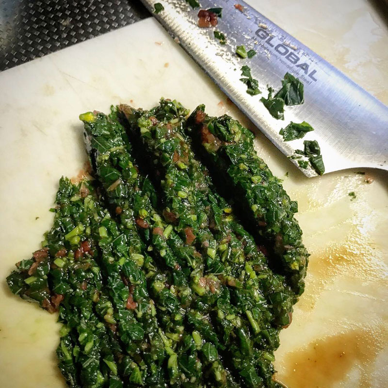 小豆島のオリーブの花についた酵母で作られた醤油で叩いて。