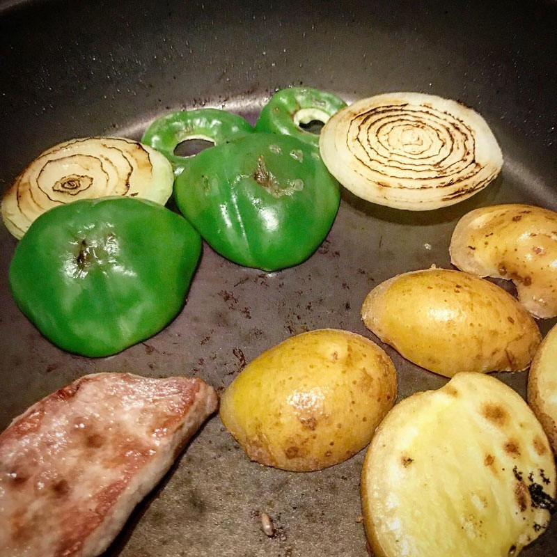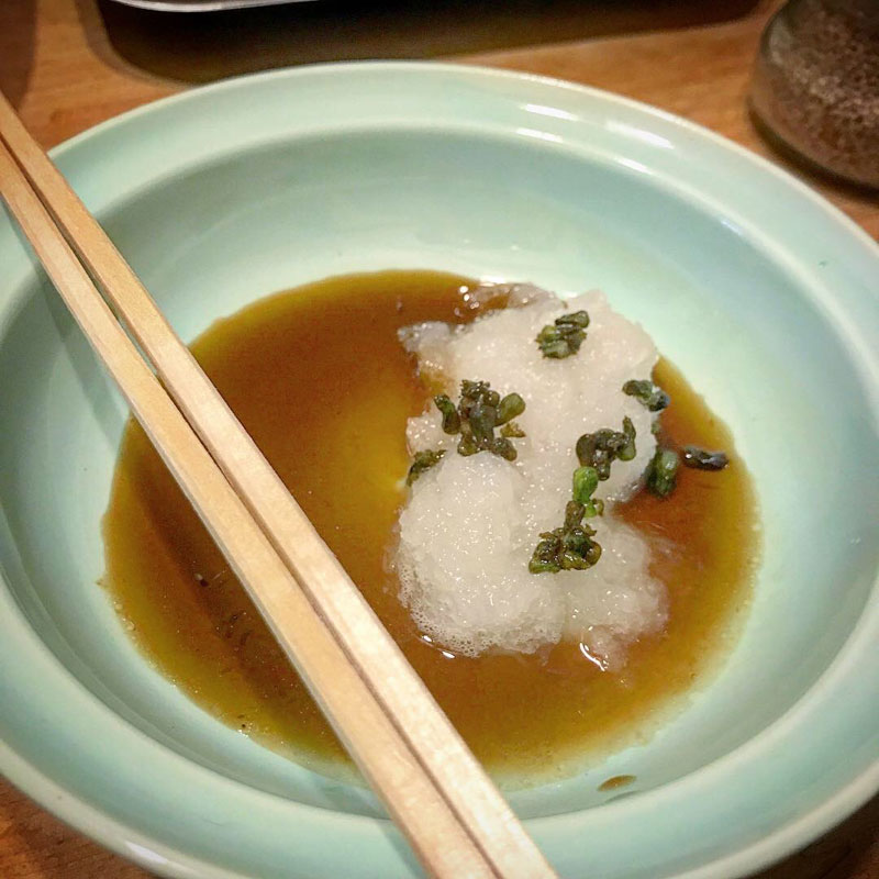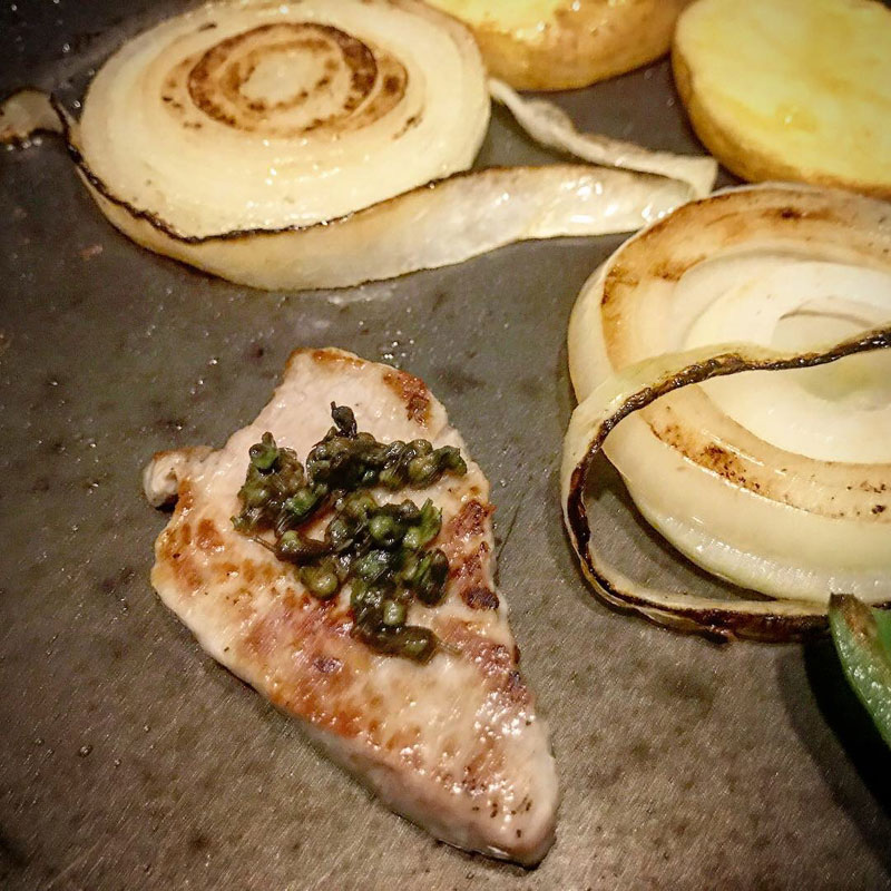ポン酢に大根おろしと畑の紫蘇の実を塩漬けにしたものを合わせたタレが肉にも野菜にも合って滅茶苦茶美味い。