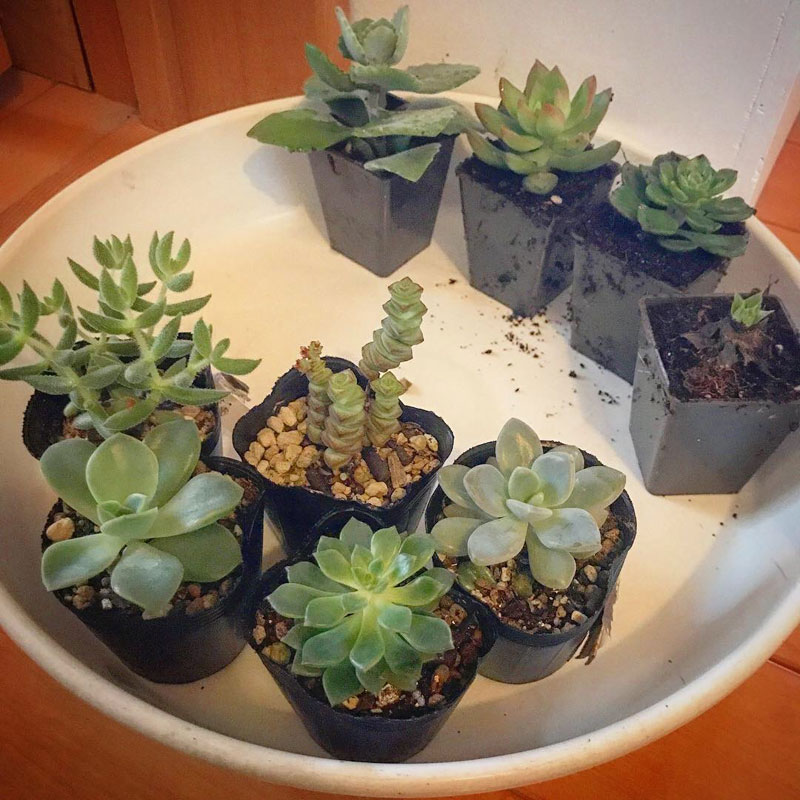 朝仕事。1ヶ月後の個展で石と組み合わせる多肉植物の世話。