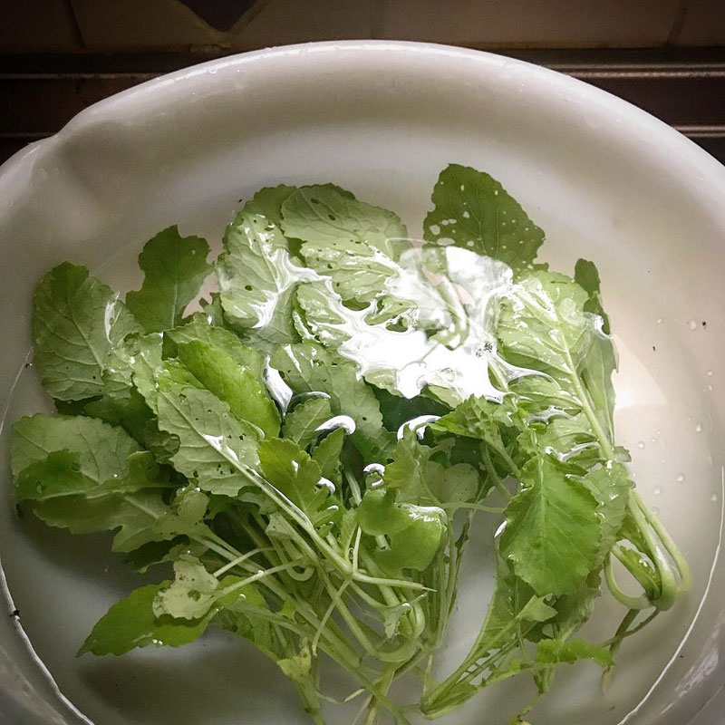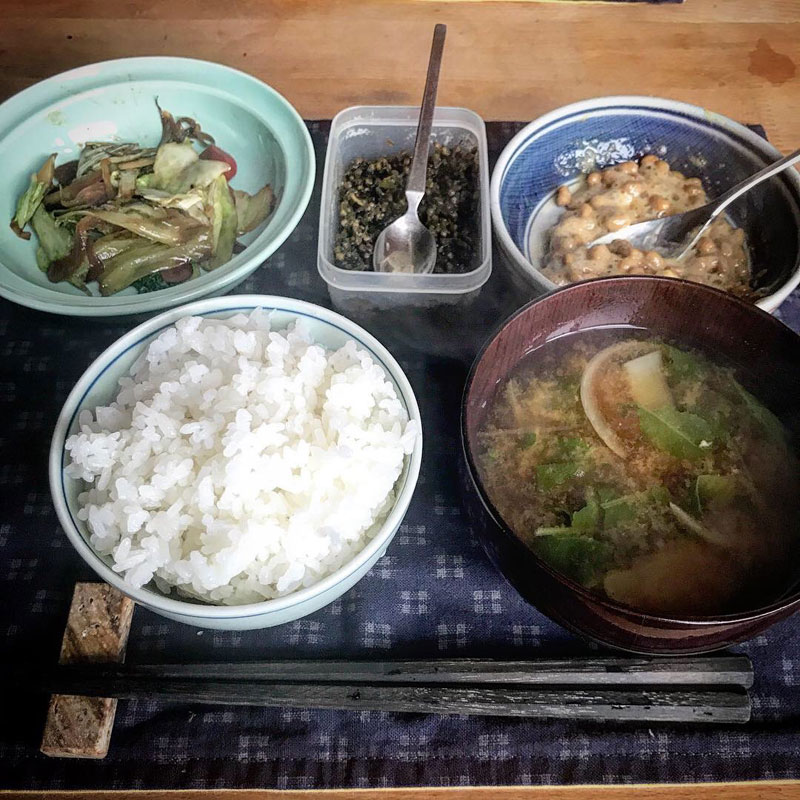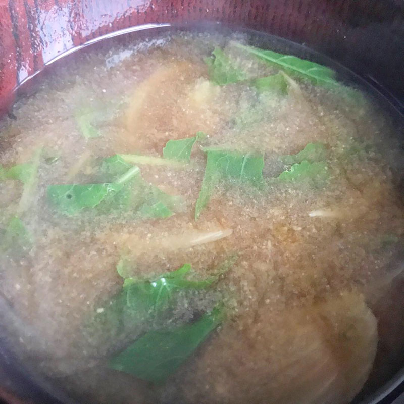 昼飯。朝、間引いた大根の味噌汁。