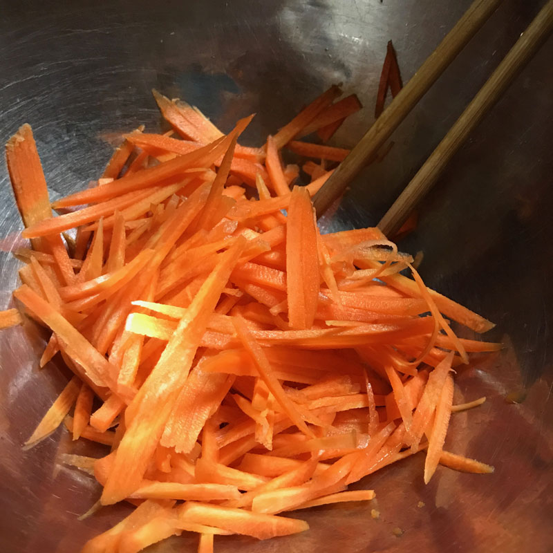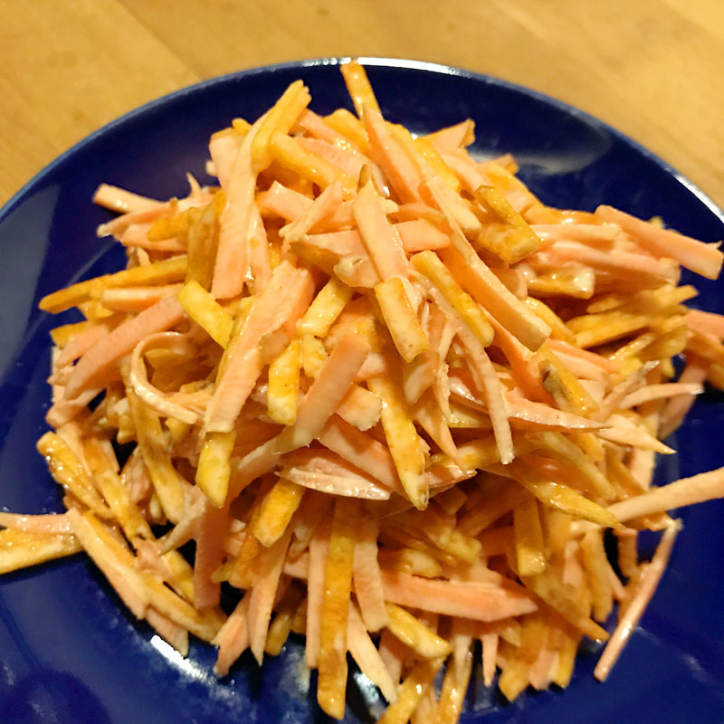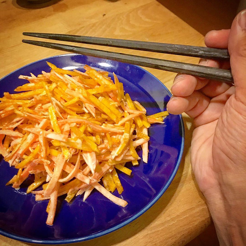 夕食の前にニンジン1本を細切りに。半年前にtwitterきっかけでネットで話題になったニンジン農家イチオシのレシピを最近知ったのでやってみるよ。