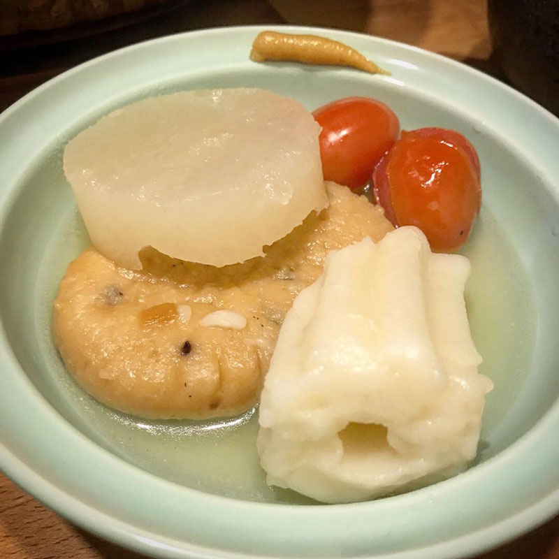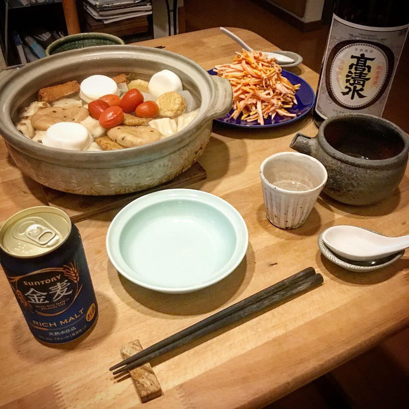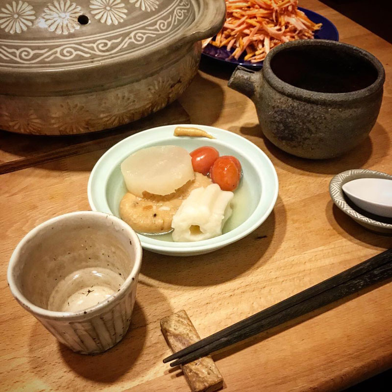 居酒屋我家、開店。先日の鍋に続いて今シーズン初おでん。おでんには日本酒。秋田の高清水。