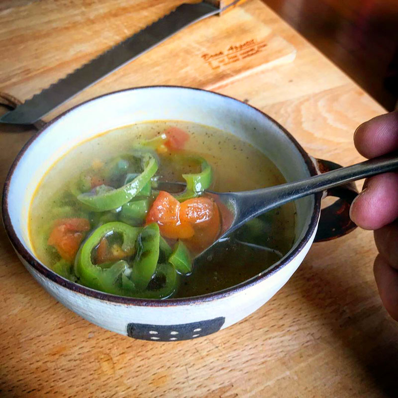 畑のピーマンミニトマトでスープ作った。