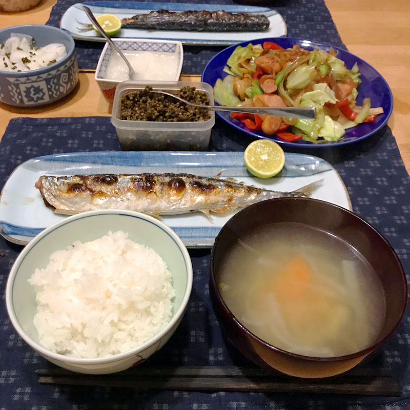 スダチ付きの秋刀魚の夕食。くー、日本酒飲みてぇ。