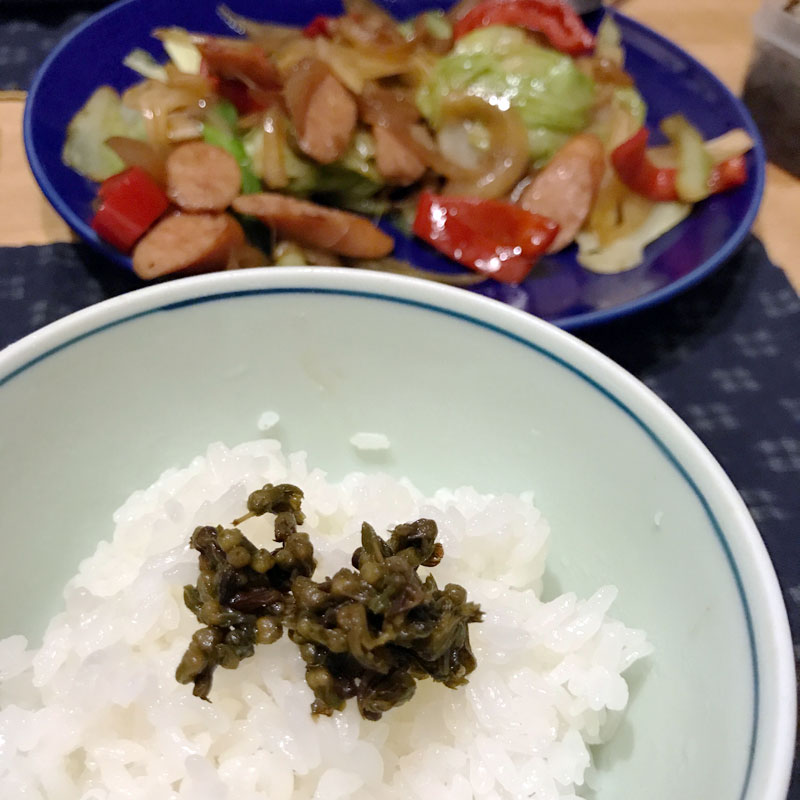新米焚いて、庭の紫蘇の実のめんつゆ漬け乗せて。