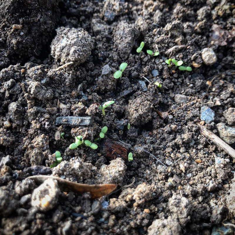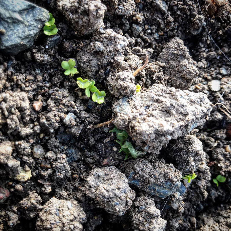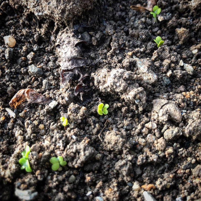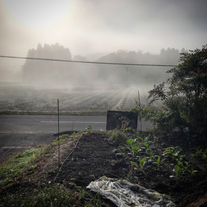 毎朝、濃い霧が出てて辺りの草はびっしょり濡れている。先日蒔いた種の発芽。