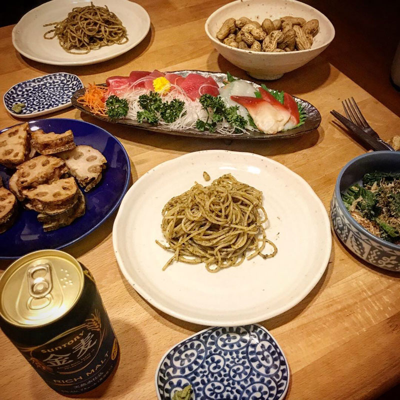 居酒屋我家、開店。夏に畑のバジルで作ったジェノベーゼソースでパスタ。