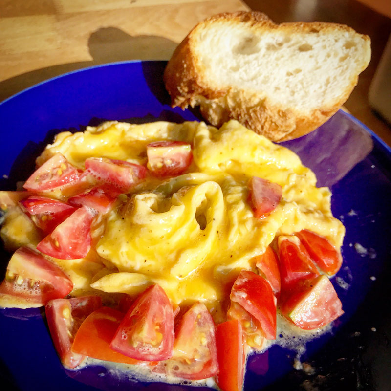 庭の畑のミニトマトがまだまだ赤い実をつけてくれているのでトマトオムレツに。この1ヶ月練習してるドレープ・オムレツでやってみたけどトマトが重くて卵が回らないので、これはいつものフライパンの柄をトントン叩いて作るつなぎ目の無いオムレツで作った方がいいな。
