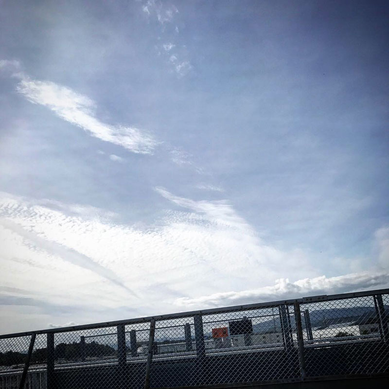 朝、庭の畑の様子を見に出てて玄関先で見上げた空。