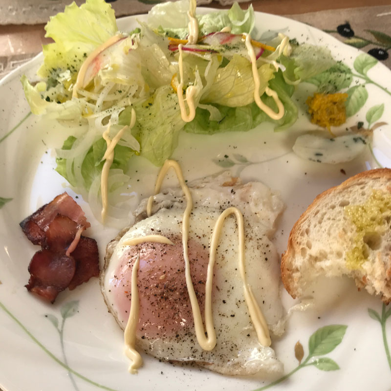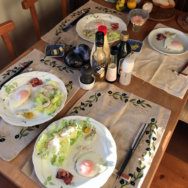 楽しかったしろまるさん+愛犬あすぱらとの夜が明けてしまいました。飲んだお酒が上等だったので全く残ってない!朝食を用意。レタスをちぎって、紅芯大根と玉ねぎをスライス。柚子の皮をちらして大根の葉を粉にしたものを散らす。