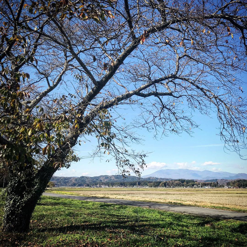 紅葉した葉の落ちた桜の木の向こうに蔵王がくっきりと見える。
