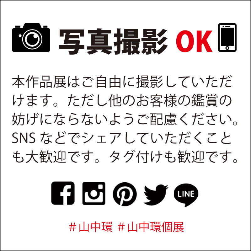 僕の個展は基本的にカメラやスマートフォン等でご自由に撮影していただけます。(他のお客様の鑑賞の妨げにならないようにだけご配慮ください)SNSなどでシェアしていただくことも大歓迎です。下記タグ付けしていただくとなお喜びます。よろしくお願いします。