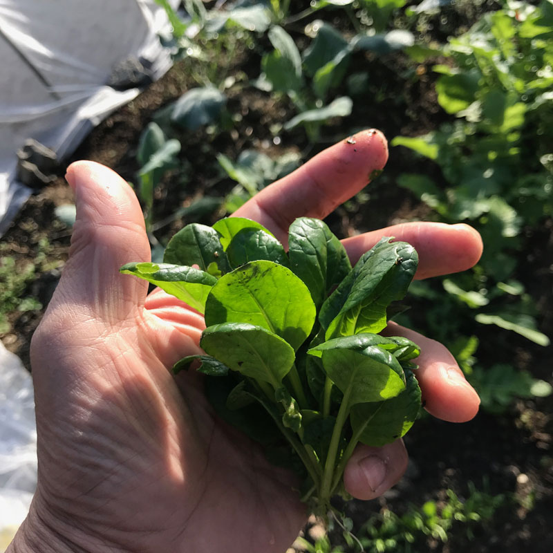 畑の雪菜。味見したくて間引いてごま油で炒めてみた。甘い。