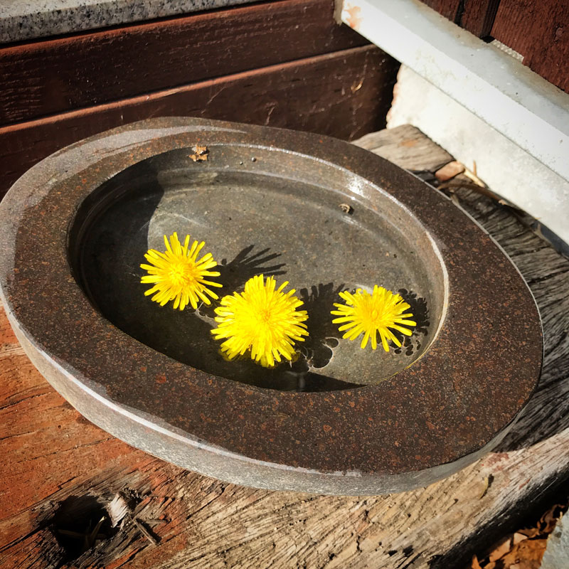 伊達冠石の水盤を玄関に置いて、庭に3つだけ生えていたタンポポの花を浮かべて歓迎しよう。