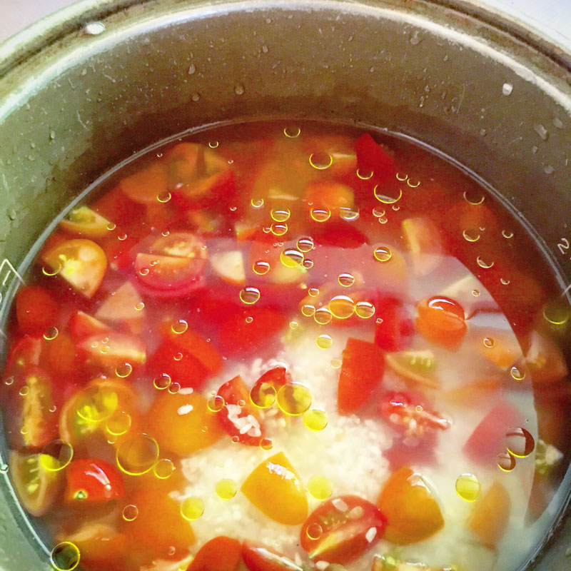 畑のミニトマトと新米でトマトライス炊いて迎えよう。