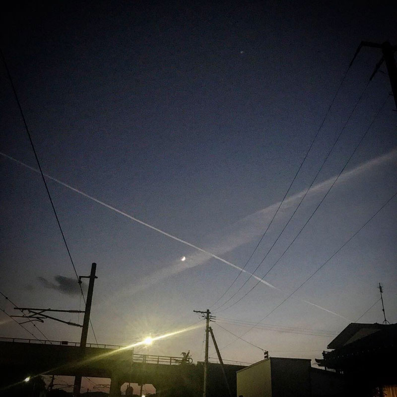 友だちの家の前から見た三日月と空。