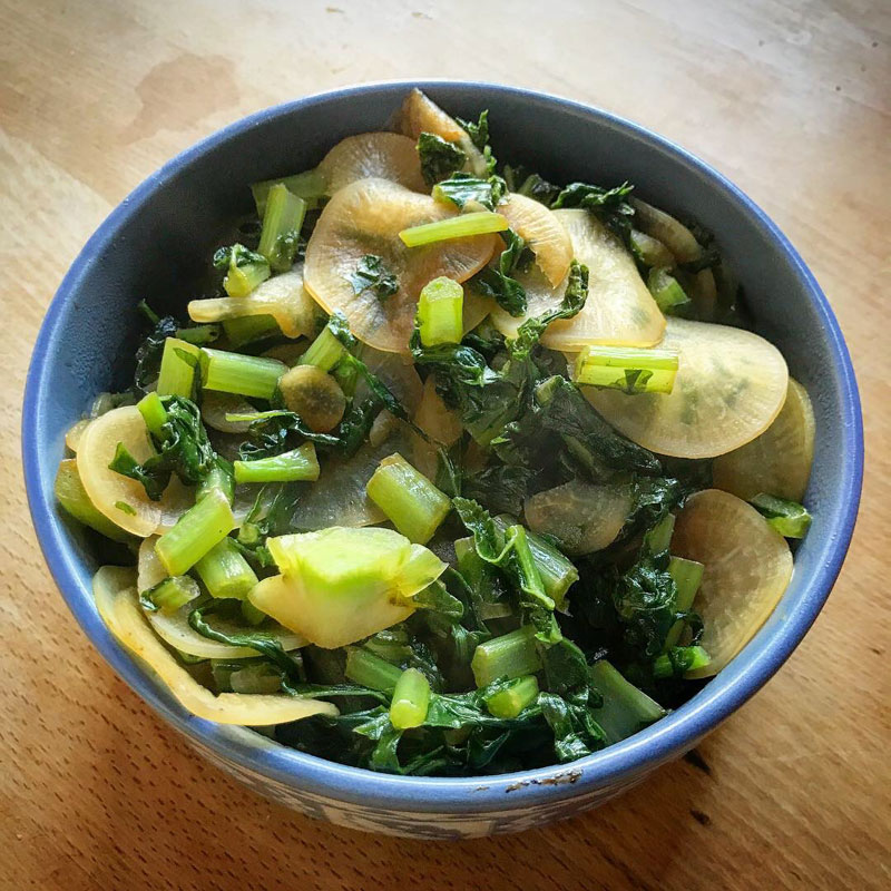 間引いた大根丸々一本に雪菜も加えてごま油で炒め物。