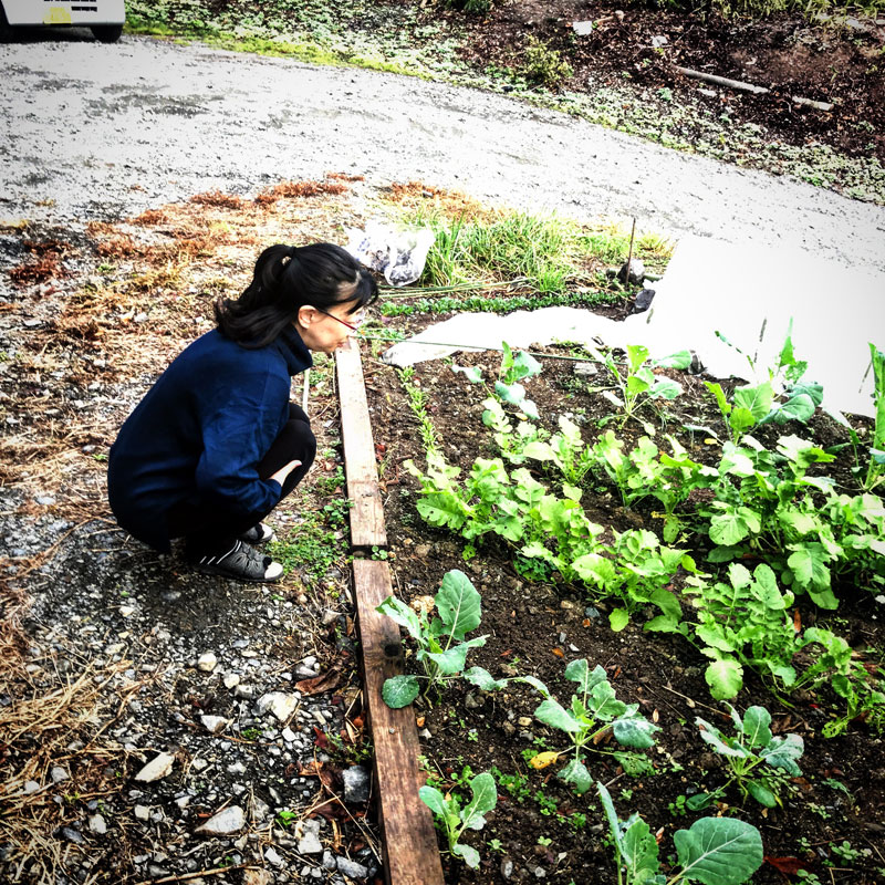畑を見つめるカミさん。コンサート近し。何を想う。