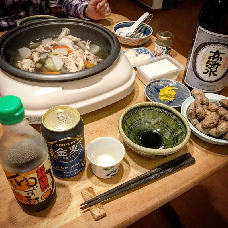 日本酒はミュゼ マエナカの万里子さんの器で。鍋はエミシ工房の池田さんの織部で。